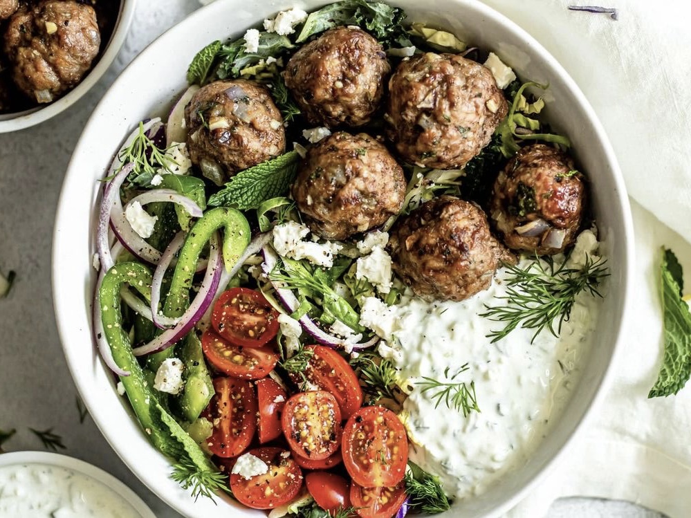 2. Во длабок сад направи салата со домат, црвен кромид и пиперка и на крај нароси многу мало парченце фета врз салатата. Во истиот сад додади го домашното зазики од грчки, краставица рендана и копар со малку масло и сол. Од кога ќе се испржат или испечат плескавичките додади ги во истиот сад и не заборавај дека не треба да користиш премногу масло додека пржиш. Тоа се екстра калории што не ги сакаме!