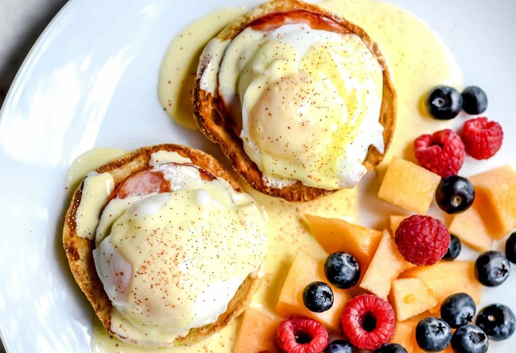 - Поставете ги пошираните јајца врз лососот и прелијте ги со подготвениот сос.