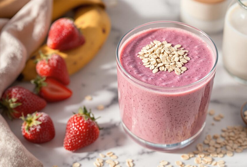 Состојки:3 лажици овес200мл растително или нискомасно кравјо млеко1 банана, излупена замрзната за подобар вкус3-4 смрзнати јагоди1 мало лажиче путер од кикиритки1 дозерка протеин со вкус…
