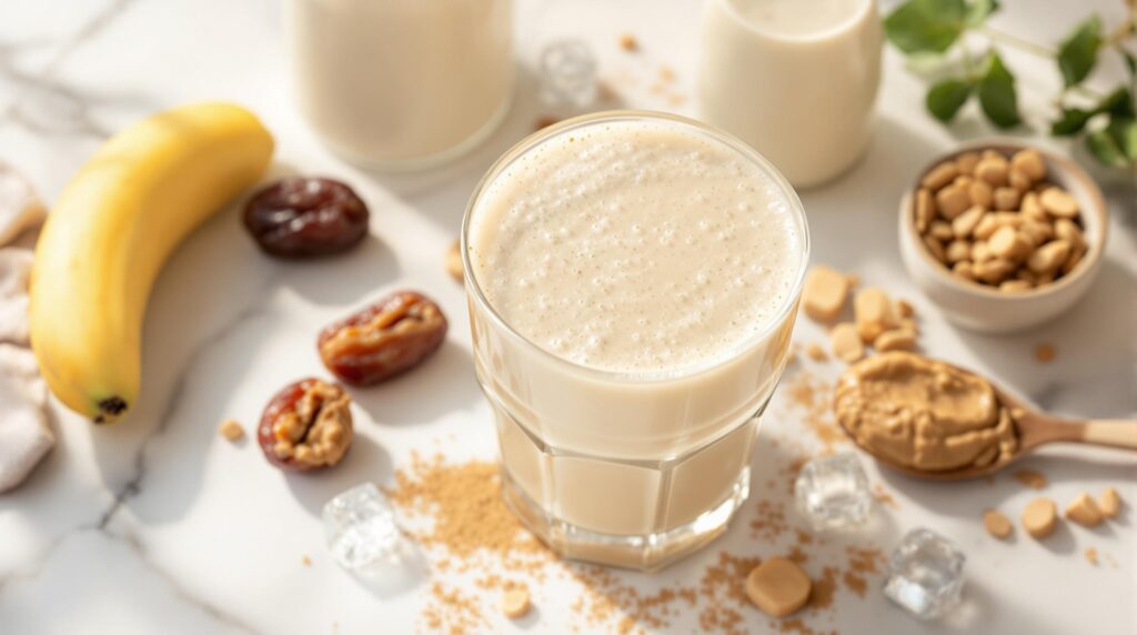 Состојки240 мл бадемово млеко2 урми без семки1 лажица кремаст путер од кикирики1 средна зрела банана, исечена и замрзната4 коцки мраз30 г ванила протеин во прав…