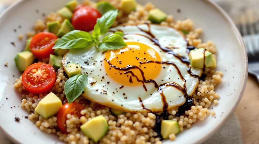 Состојки– 160 мл вода– 50 г киноа, измиена– сол– црн пипер– 1 големо јајце– 125 г шери домати, пресечени на половина– 15 г свежи листови…
