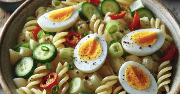 Состојки50гр интегрални макарониПраз (исечкан ситно, за свежина)Печени црвени пиперки (на коцки)Кисели краставички (малку за киселкаст вкус)Јајца 2 варени1 лажица маслиново масло Начин на подготовка: Свари ги…