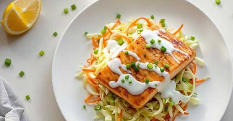 Состојки:120 г лосос филе1 лажичка маслиново масло1 мала главица зелка1 мал морков рендан150 гр грчки јогурт1 лук1 лажичка лимонов сокмалку сол, бибер и мелен кумин…