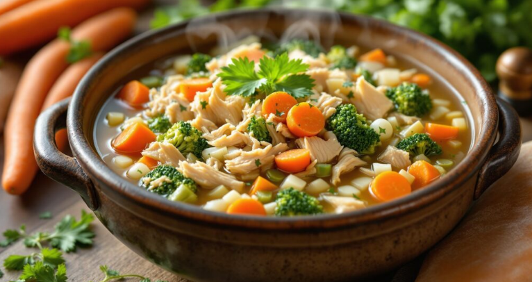 Состојки:– 1 мал кромид, ситно исечкан– 2 моркови, исечкани на коцки– 50г корен од магдонос, исечкан на коцки– 100г брокула цветчиња– 100г пашканат, исечкан на…