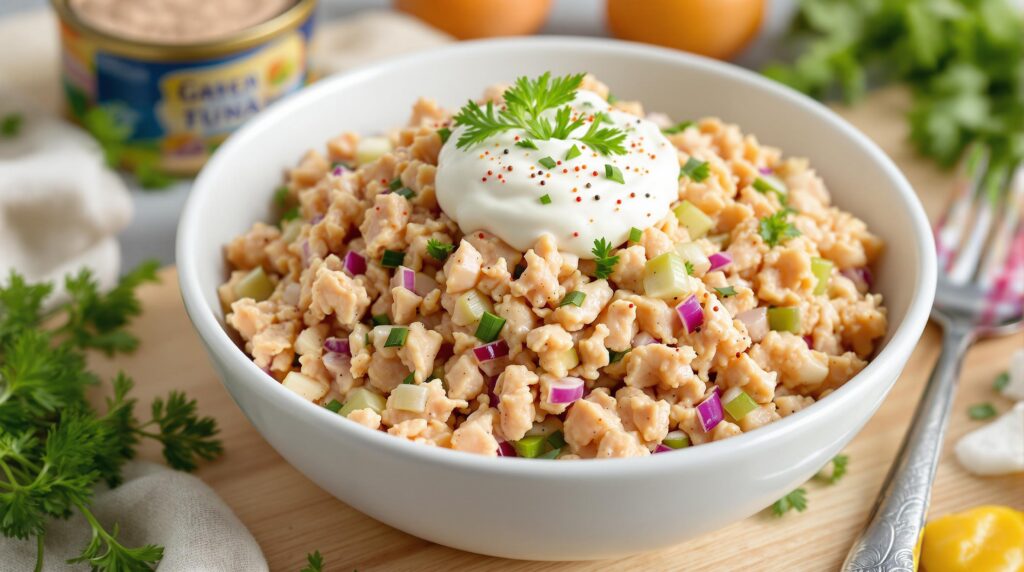 Состојки1 мала конзерва туна, исцедена2 лажици ситно сечкан кромид2 лажици ситно сечкан целер1 лажица грчки јогурт1 лажица сенф1 лажица свеж магдонос, сечкан1 лажичка свеж копар,…