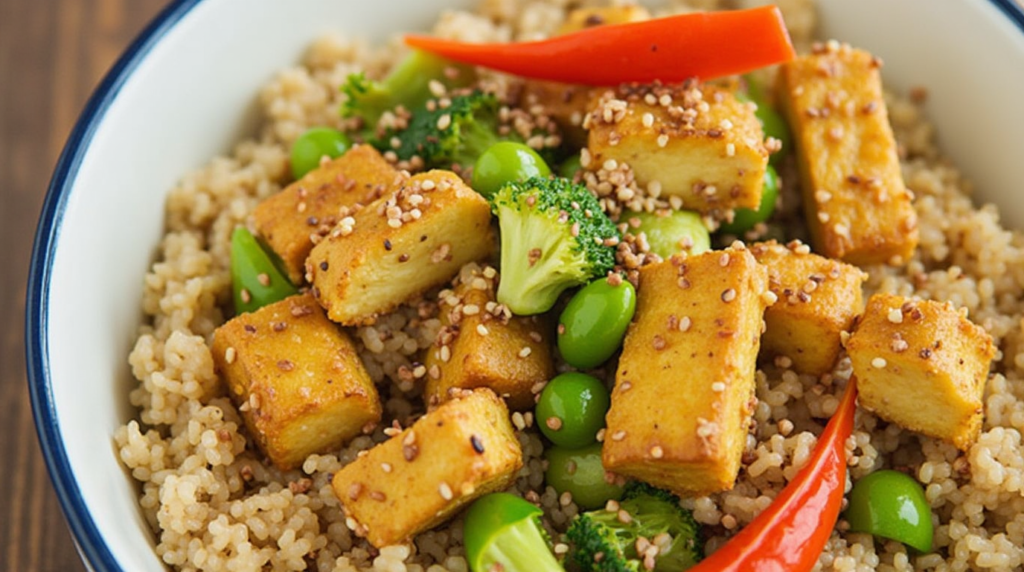 Состојки: Начин на подготовка: На загреана тава пропржете го тофуто заедно со мешаниот зеленчук и додадете лук и ѓумбир. Додека се пржат, додајте соја сос…