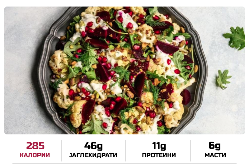 Оризот и гравот треба да ги свариш, а карфиолот со малку зачини да го потпечеш. Цвеклото изрендај го, и прсни му солче и сок од лимон, авокадото испасирај го и прсни му солче, бибер и сок од лимон. Нареди си во чинија, сликни и промешај се заедно. Ако ти фали нешто за вкус додај си зачин и маслиново масло 1 лажица.