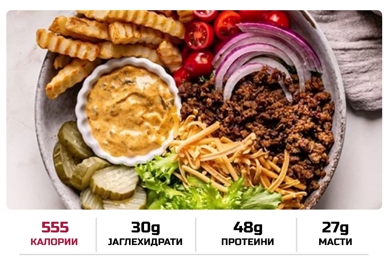 Хо хо хо, каков почеток на летен предизвик, кој ќе јаде чизбургер денеска, а не е ниту Божиќ за чит мил, Велигден помина…. Ајде да се сосредоточиме на подготовката. Прво компирот исецкан на помфрит пропржи го или испечи го на хартија, за што имаш време за тоа но внимавај да не користиш премногу масло. Меленото месо со зачини се пропржува (ако си веге, изрендај го тофуто и повтори ја постапката како и за месото), а за тоа време ти спремај си ја чинијата. Исецкај ги марулата, краставицата, доматот и кромидот и постави ги во чинијата. Врз нив постави го месото и помфритот, па чедарот за да се растопи додека е топло. На крај прелиј со дресинг и благословувај ме додека ручаш.