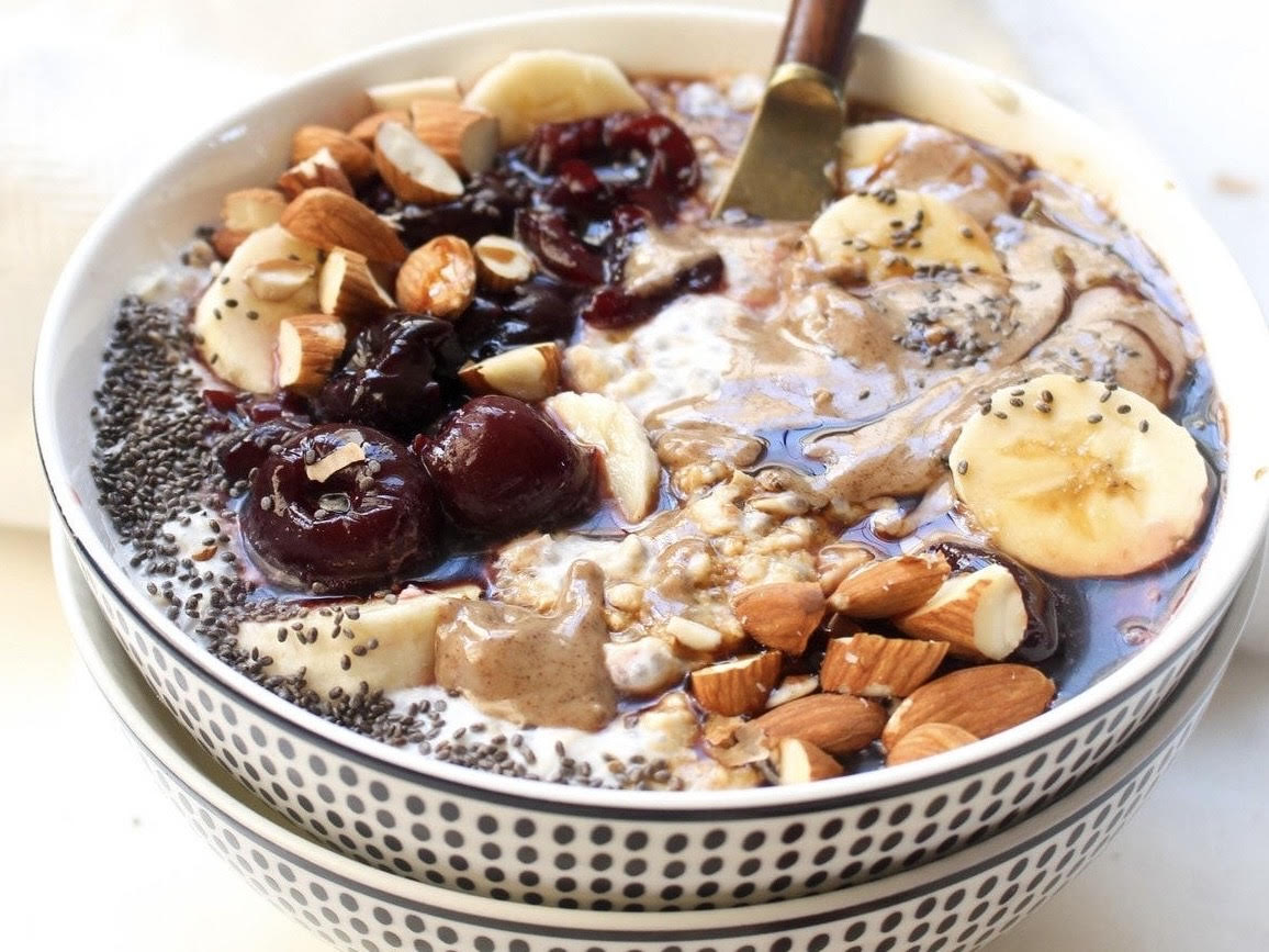 - Кога кашата ќе ја достигне посакуваната густина, додадете ги преостанатата банана, путерот од лешник, и замрзнатите цреши за да омекнат врз топлата каша.