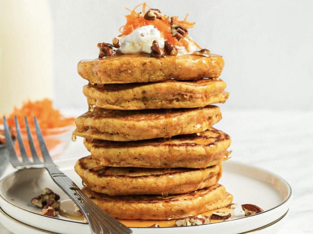 Измешајте ги состојките додека не се добие густо тесто за палачинки. Загрејте нелеплива тава на средна температура и ставете дел од тестото за да направите палачинка. Печете додека палачинката добие златно-кафена боја од двете страни. Послужете ги со малку јаворов сируп по желба.