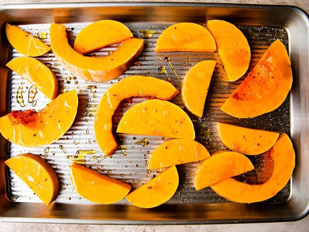 3. Наредете ги парчињата тиква на тава за печење, обложена со хартија за печење.