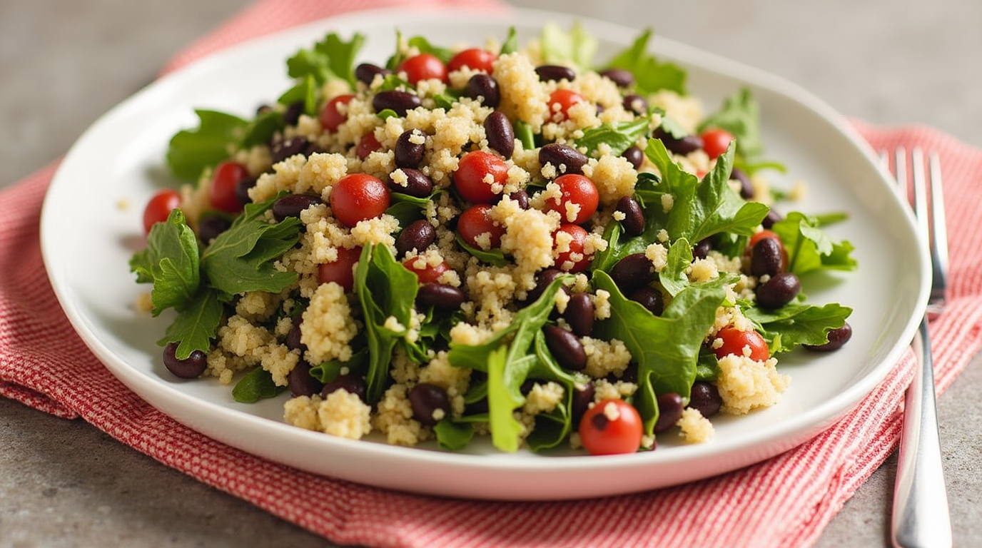 Комбинирајте ги состојките: Во голем сад измешајте ја сварената киноа, црн грав, пченка, пиперка, црвен кромид и магданосот.