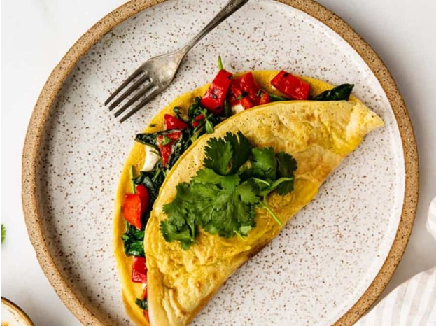 Исецкајте ги зеленчуците и пропржете ги на малку маслиново масло додека не омекнат, па тргнете ги настрана. Во длабок сад, измешајте ги брашното од наут, меленото ленено семе, пецивото, нутритивниот квасец и зачините. Постепено додавајте растително млеко или вода, мешајќи постојано за да не се создадат грутки, додека не добиете хомогена смеса. Додадете ги пропржените зеленчуци во смесата и измешајте. Загрејте тава на средна температура и печете палачинки со смесата, поделете ги на два оброка. За прилог, изгмечете го авокадото, додајте му сок од лимон и сол, и поделете го преливот на два оброка.